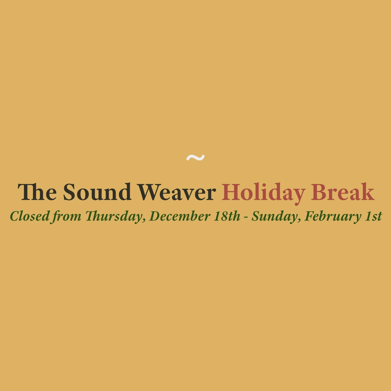Music Studio Holiday Break Thursday, December 18, 2025 8:00 AM 08:00 Sunday, February 1, 2026 12:00 PM 12:00 The Sound Weaver Australia (map) Google Calendar ICS CLICK HERE TO SIGN UP FOR THE NEWSLETTER